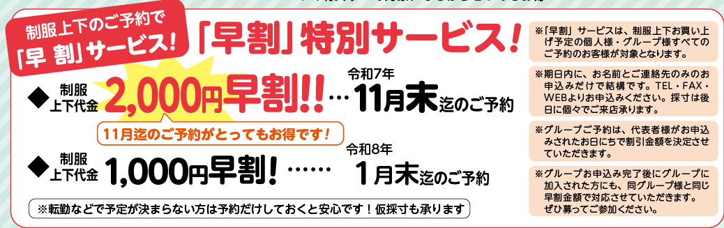 ※「早割」サービスは、制服上下お買い上げ予定の個人様・グループ様すべてのご予約のお客様が対象となります。