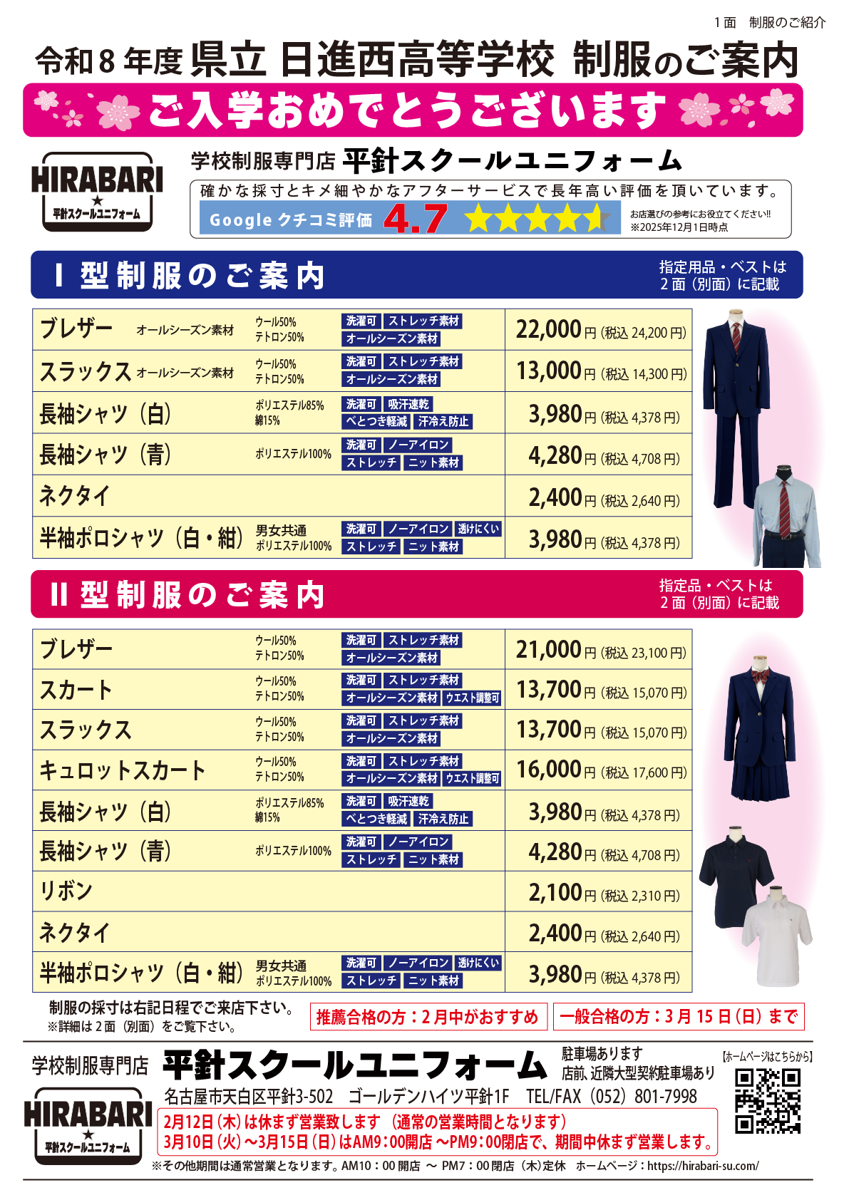 日進西高校の制服も「平針スクールユニフォーム」に お任せ下さい。